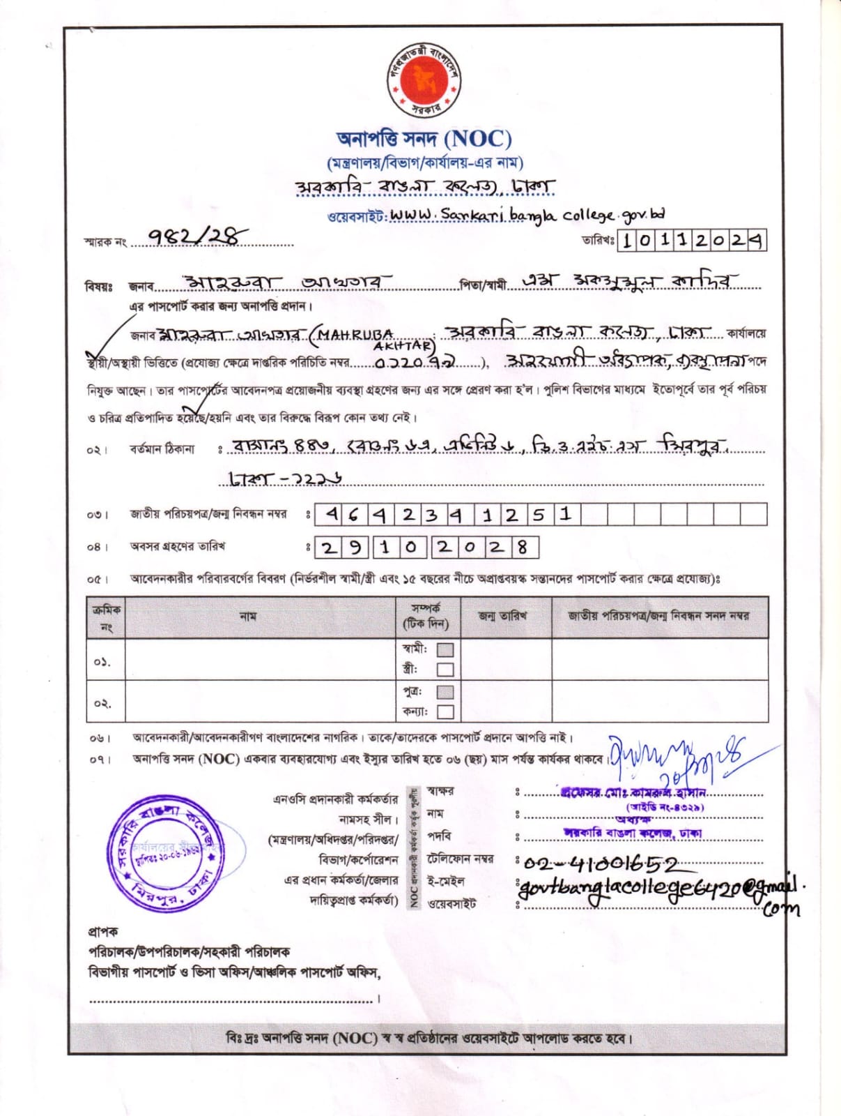 জনাব মাহরুবা আক্তারের অনাপত্তিপত্র