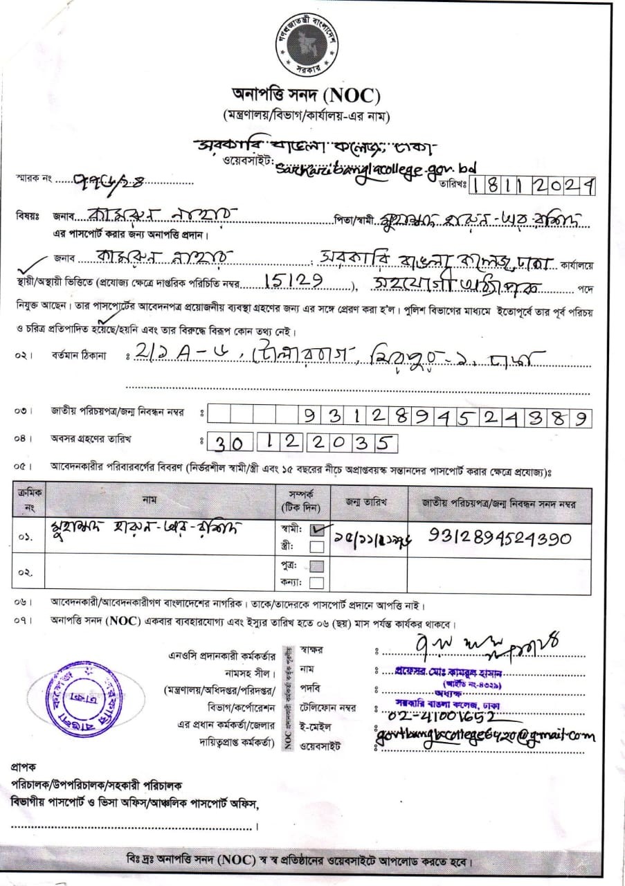 জনাব কামরুন নাহারের অনাপত্তিপত্র