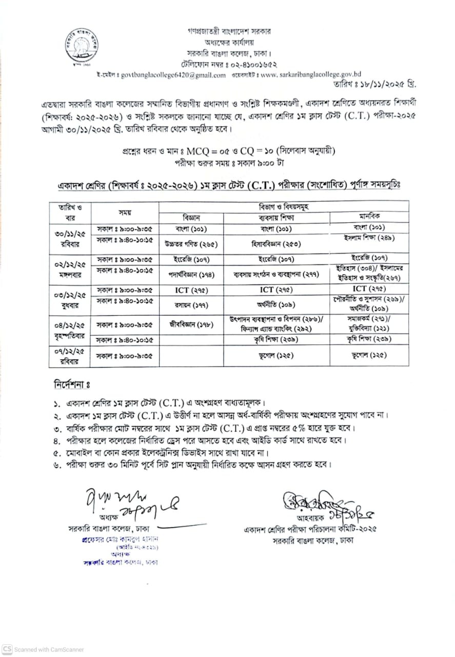 একাদশ শ্রেণি (শিক্ষাবর্ষ:২০২৫-'২৬) এর ১ম ক্লাস টেস্ট (C.T) এর সংশোধিত সময়সূচি
