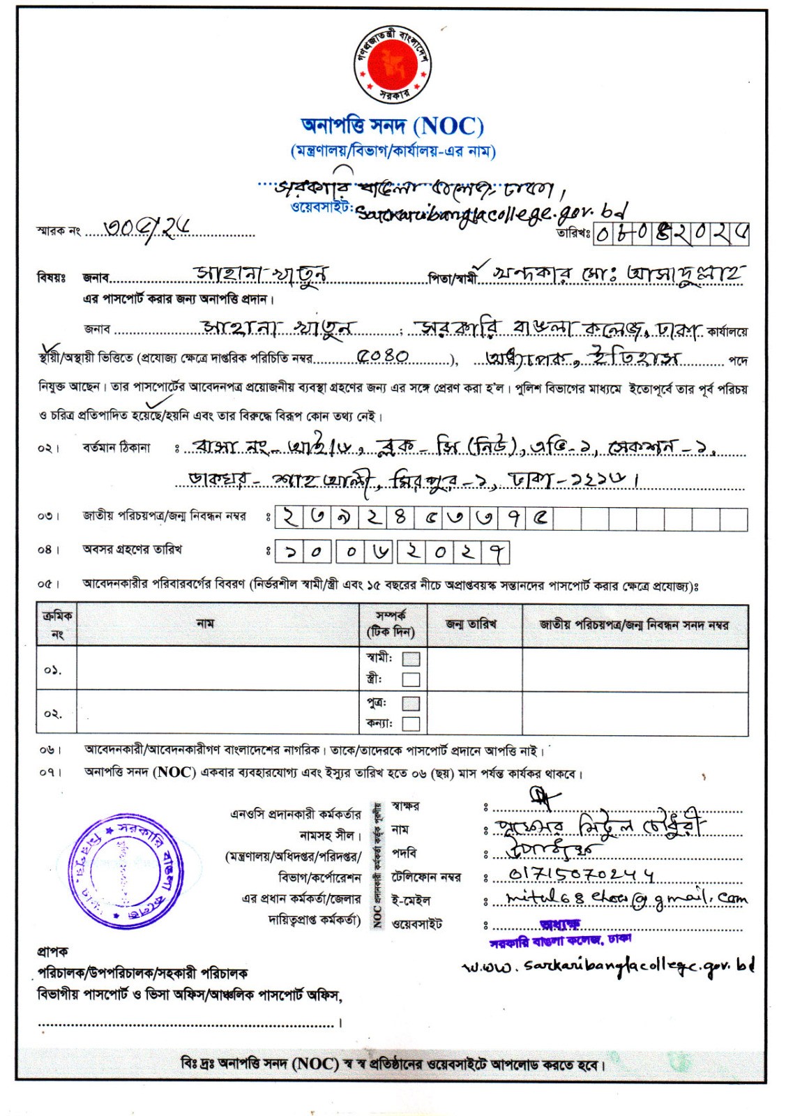 জনাব মো: জহিরুল ইসলাম, সহকারী অধ্যাপক, অর্থনীতি এর অনাপত্তি সনদ (NOC)