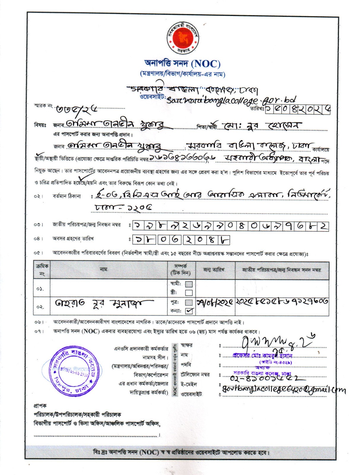 মোঃ ইকবাল হোসেন এর NOC