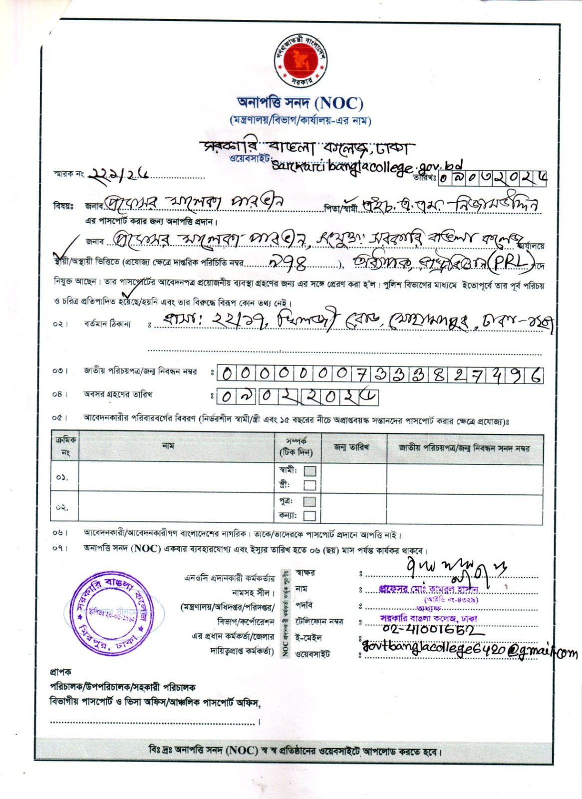 প্রফেসর মালেকা পারভীন, রাষ্ট্রবিজ্ঞান (PRL) এর NOC