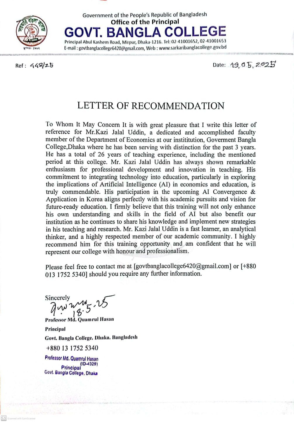 Recommendation letter of Mr. Kazi Jalal Uddin