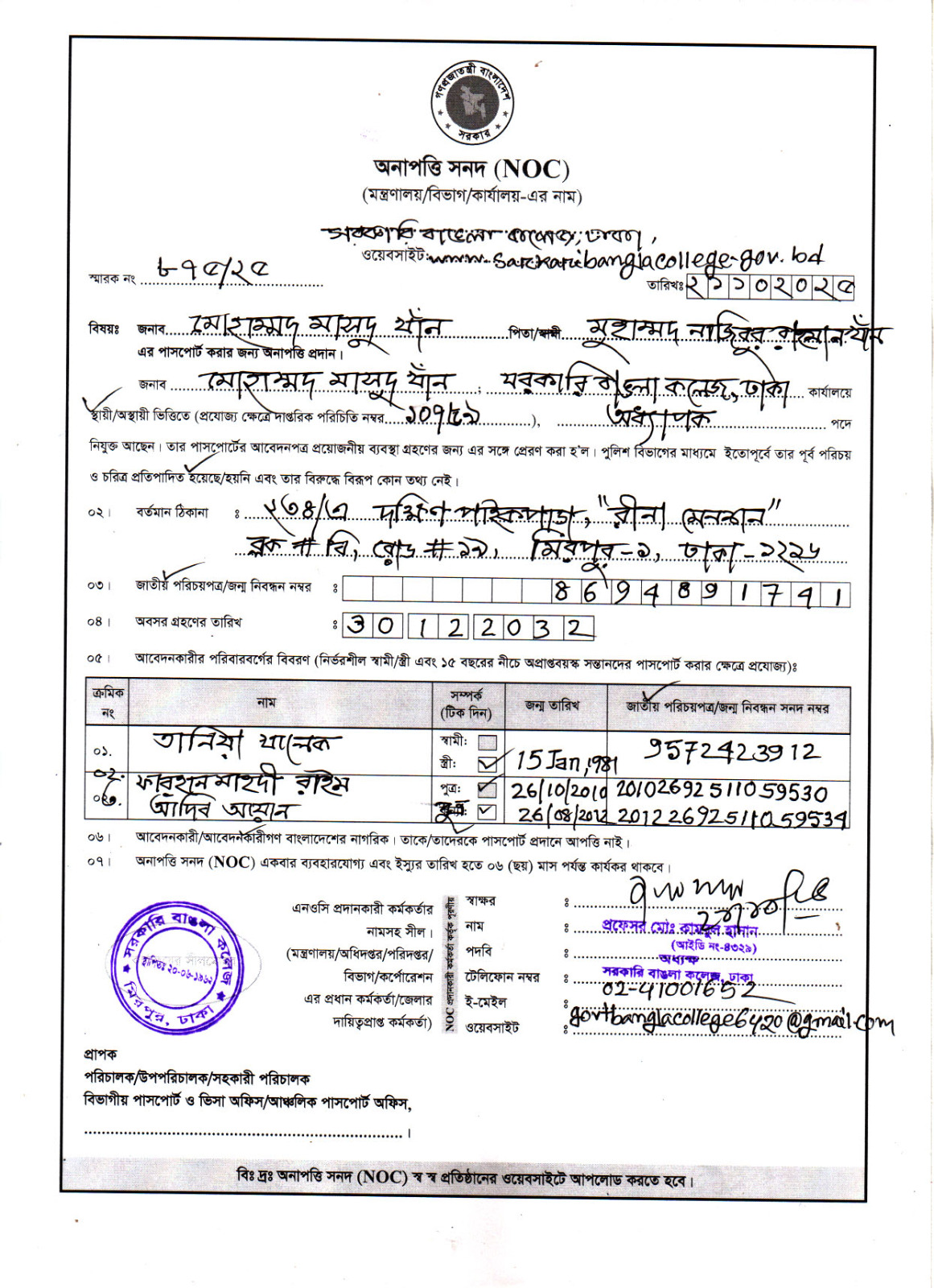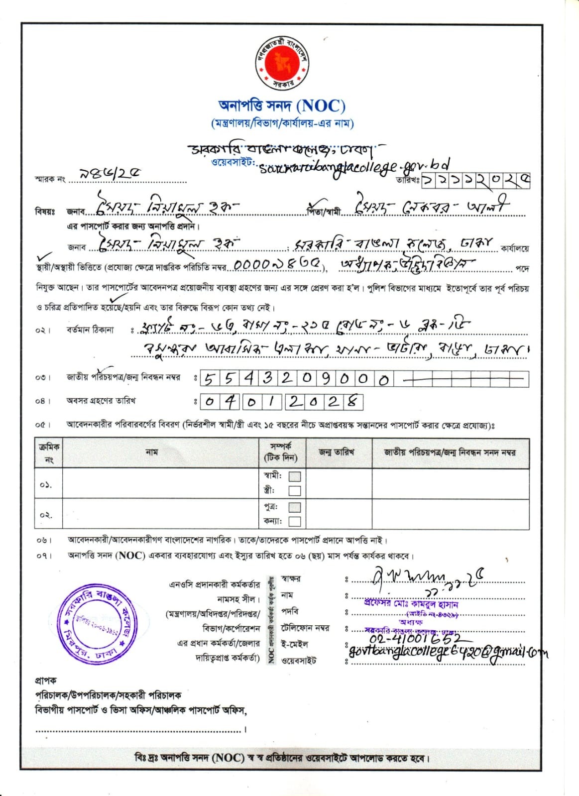 জনাব মো: জহিরুল ইসলাম, সহকারী অধ্যাপক, অর্থনীতি এর অনাপত্তি সনদ (NOC)