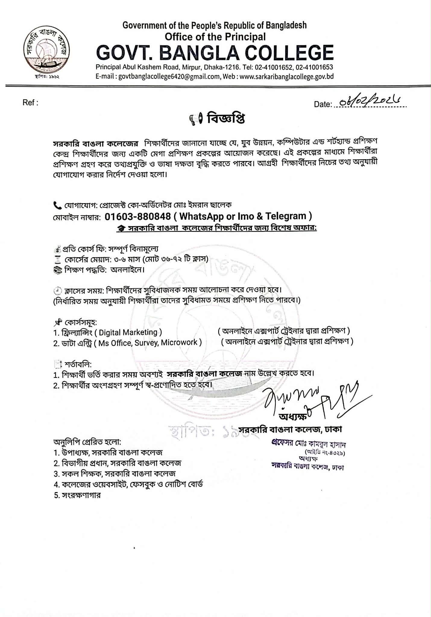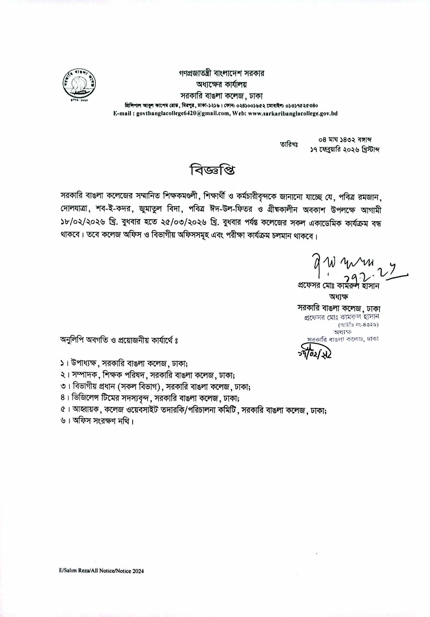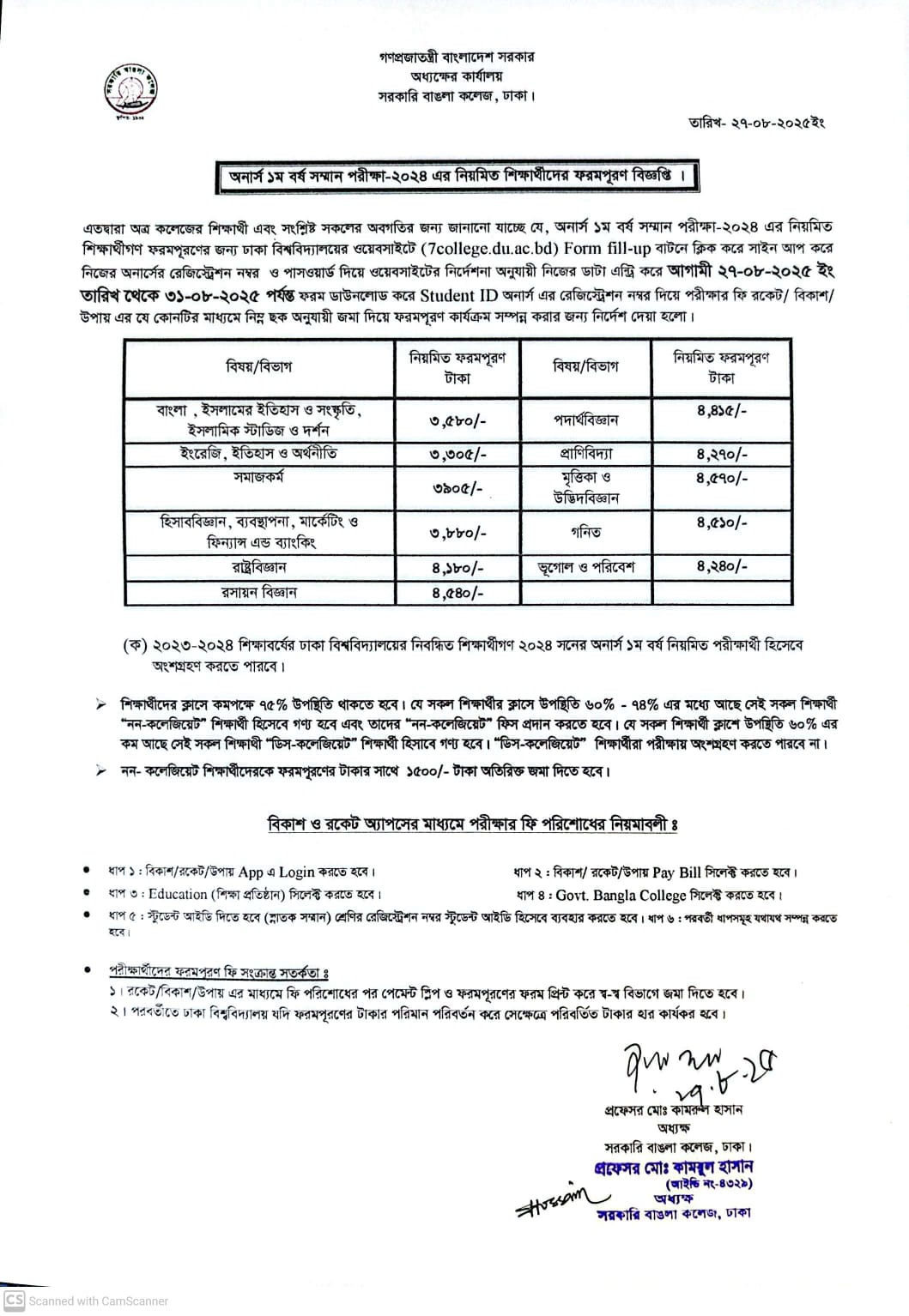 অনার্স ১ম বর্ষ সম্মান পরীক্ষা-২০২৪ এর নিয়মিত শিক্ষার্থীদের ফরমপূরণ বিজ্ঞপ্তি