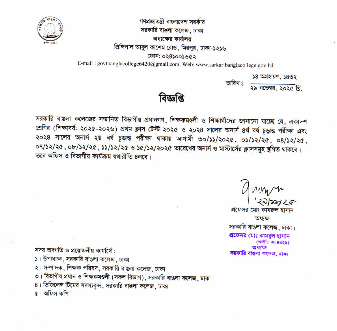 একাদশ শ্রেণি (শিক্ষাবর্ষ:২০২৫-'২৬) এর ১ম ক্লাস টেস্ট (C.T) এর সংশোধিত সময়সূচি