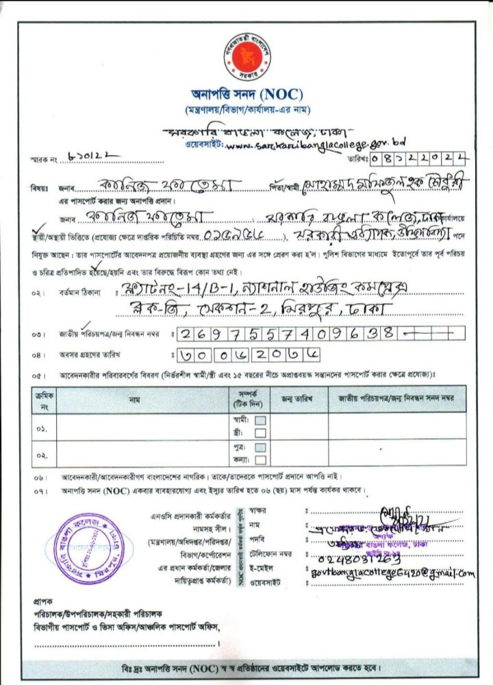 জনাব কানিজ ফাতেমার অনাপত্তিপত্র।