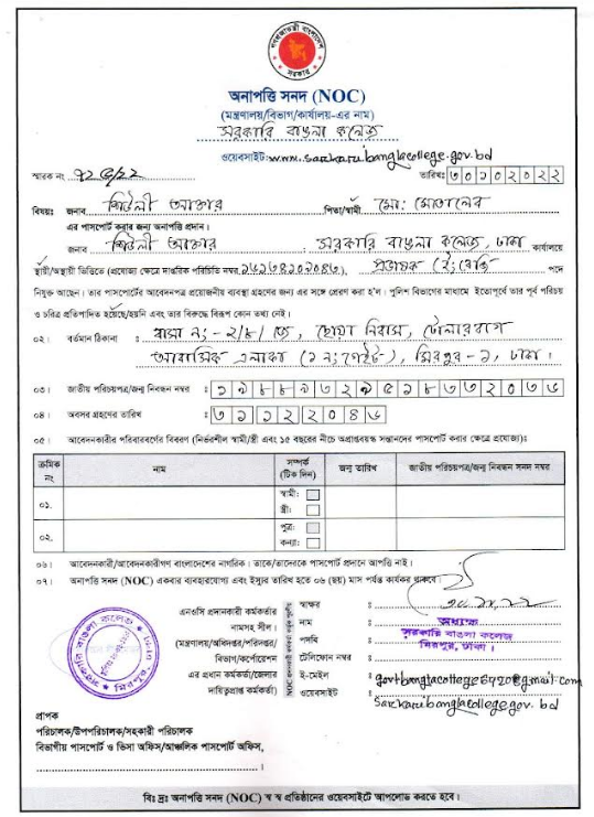 জনাব শিউলি আক্তারের অনাপত্তিপত্র।
