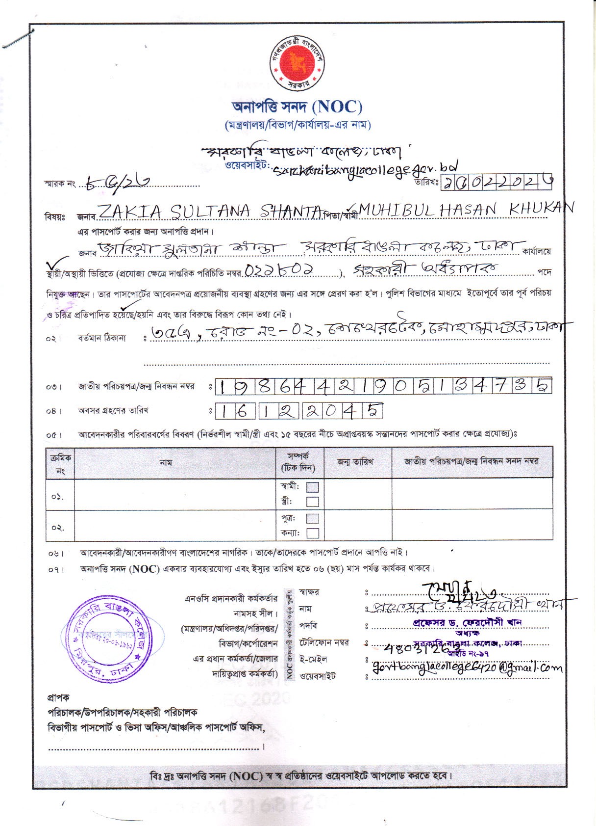 জনাব জাকিয়া সুলতানা শান্তার অনাপত্তিপত্র।