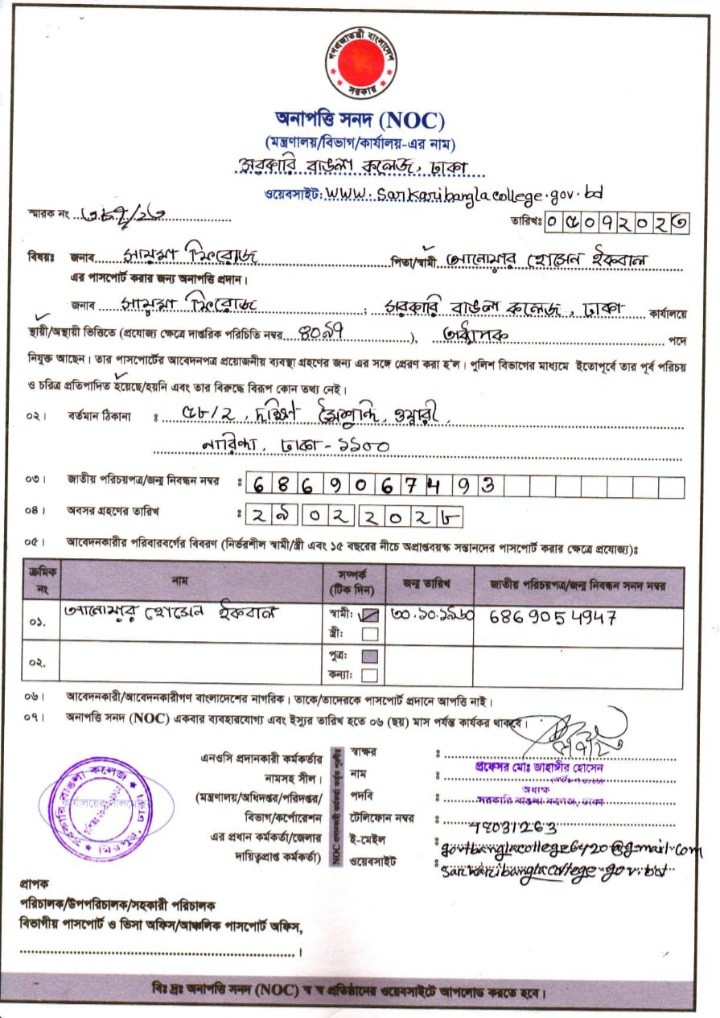 জনাব সায়মা ফিরোজের অনাপত্তিপত্র