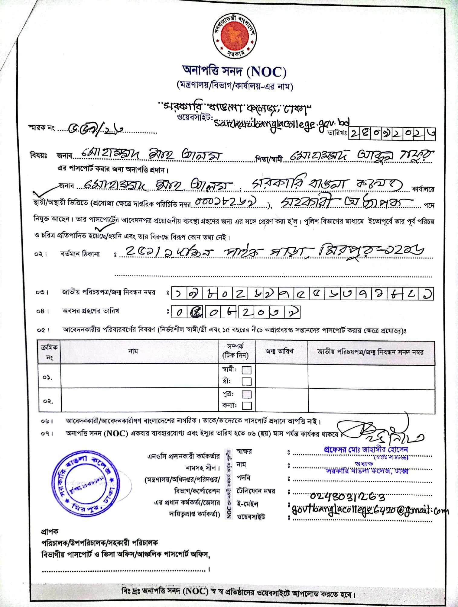 জনাব শাহ আলম এর অনাপত্তিপত্র
