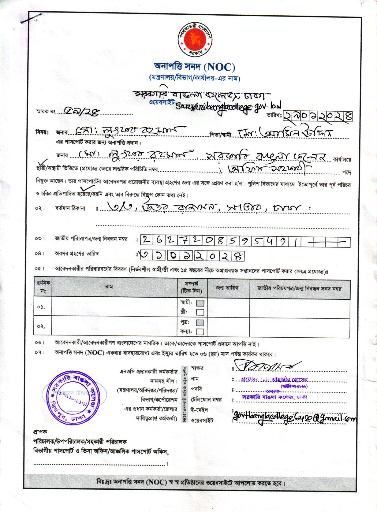 জনাব লুৎফর রহমান এর অনাপত্তিপত্র