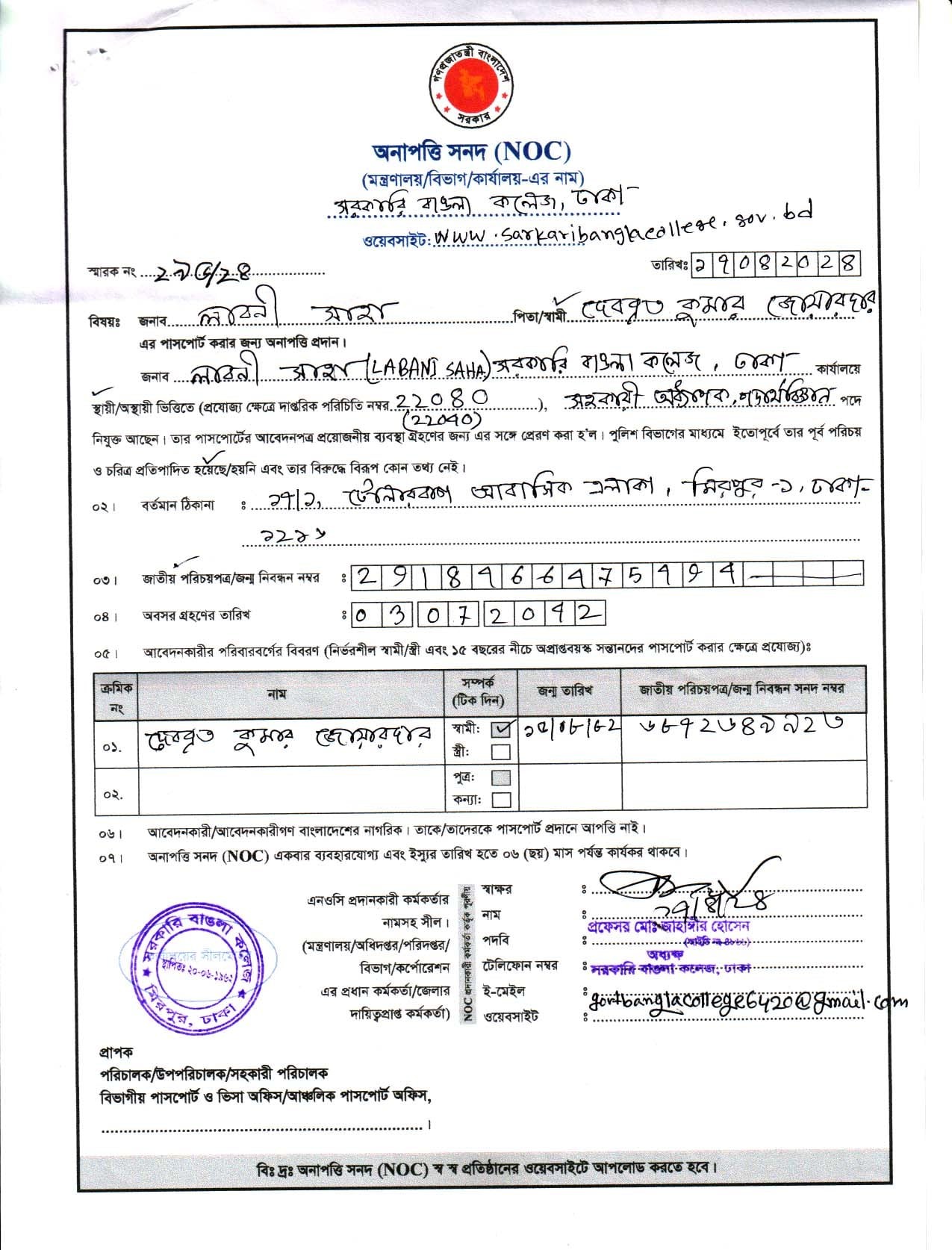 জনাব লাবনী সাহা এর অনাপত্তিপত্র