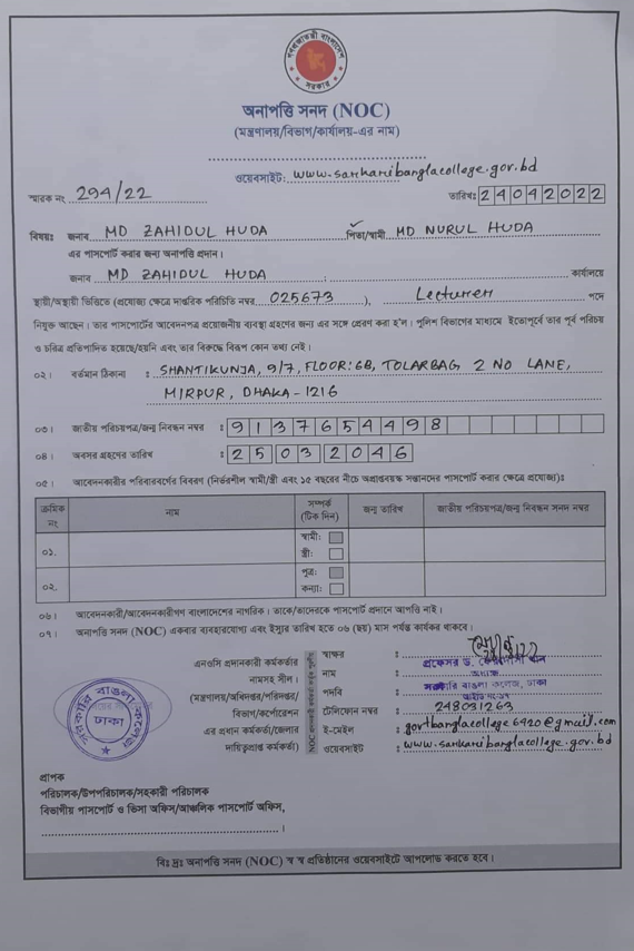 জনাব জাহিদুল হুদার অনাপত্তিপত্র