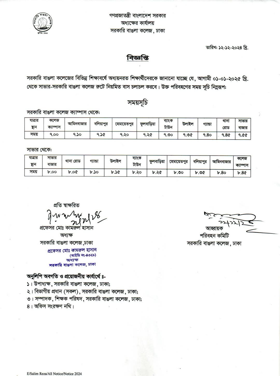 সাভার - সরকারি বাঙলা কলেজ রুটে কলেজ বাস চলাচলের সময়সূচি