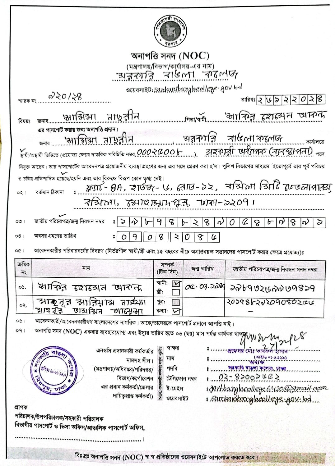 জনাব কাজী আসমা সিদ্দিকা এর অনাপত্তিপত্র