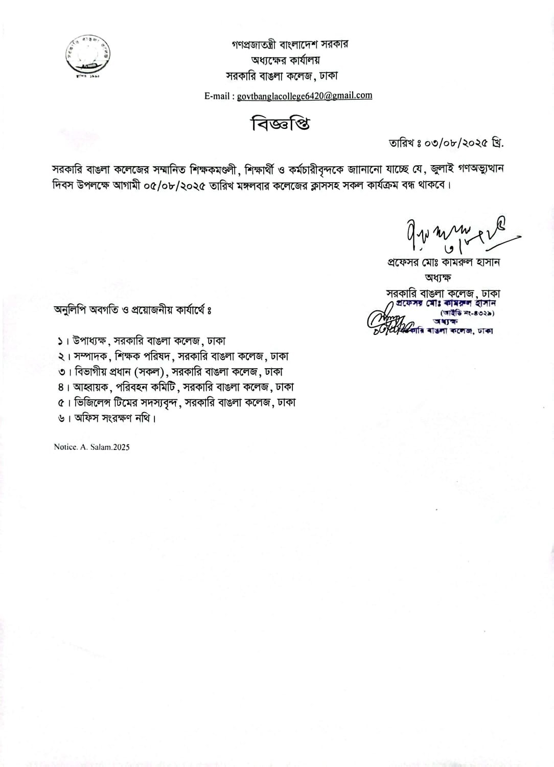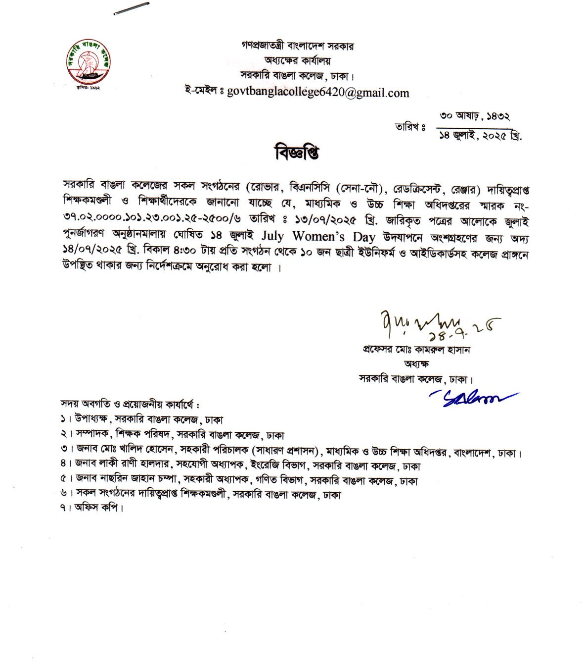 জুলাই গণঅভ্যুত্থান দিবস -২০২৫ উদযাপন সংক্রান্ত বিজ্ঞপ্তি