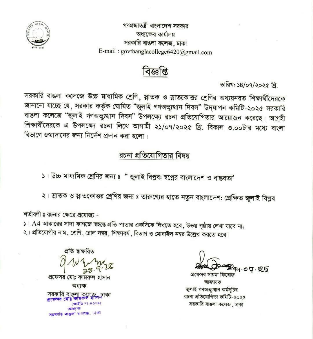 "জুলাই গণঅভ্যুত্থান দিবস" উপলক্ষে রচনা প্রতিযোগিতা