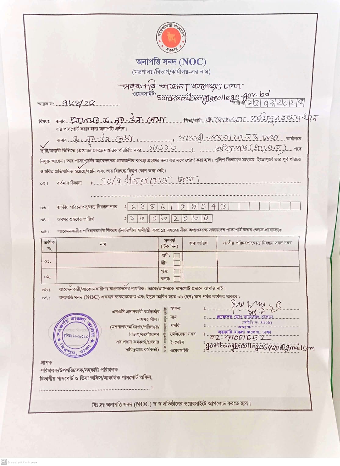 প্রফেসর ড. নূর উন নেসা এর অনাপত্তিপত্র