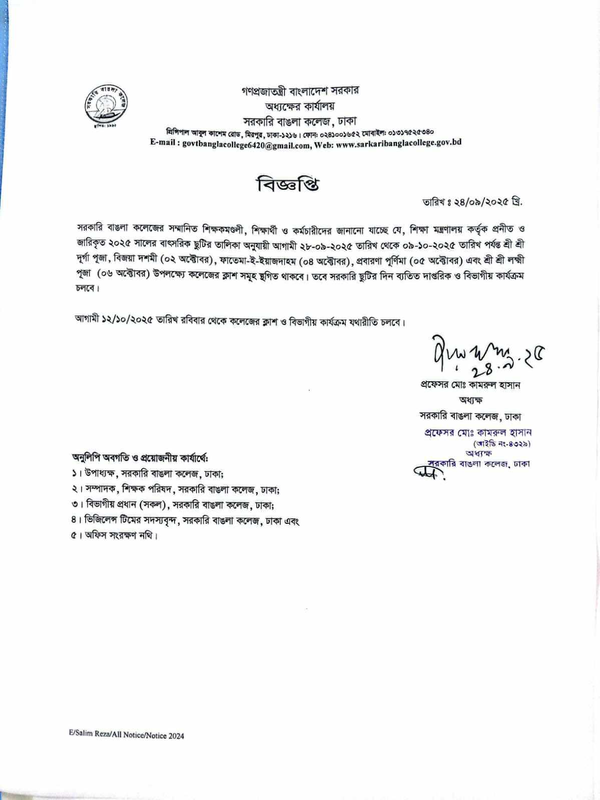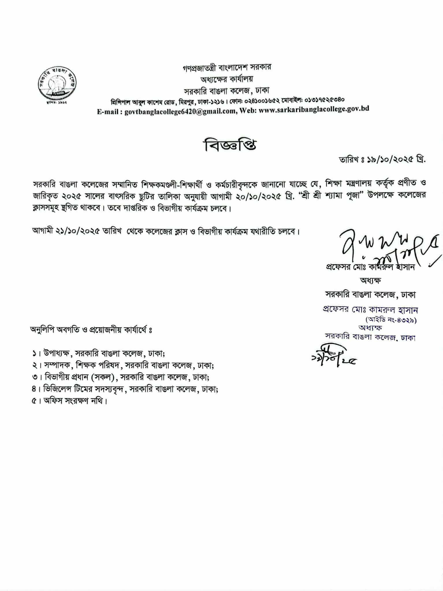 শ্রী শ্রী দূর্গা পূজা, বিজয়া দশমী, ফাতেমা-ই-ইয়াজদাহম, প্রবারণা পূর্ণিমা এবং শ্রী শ্রী লক্ষ্মী পূজা উপলক্ষ্যে ছুটি সংক্রান্ত বিজ্ঞপ্তি