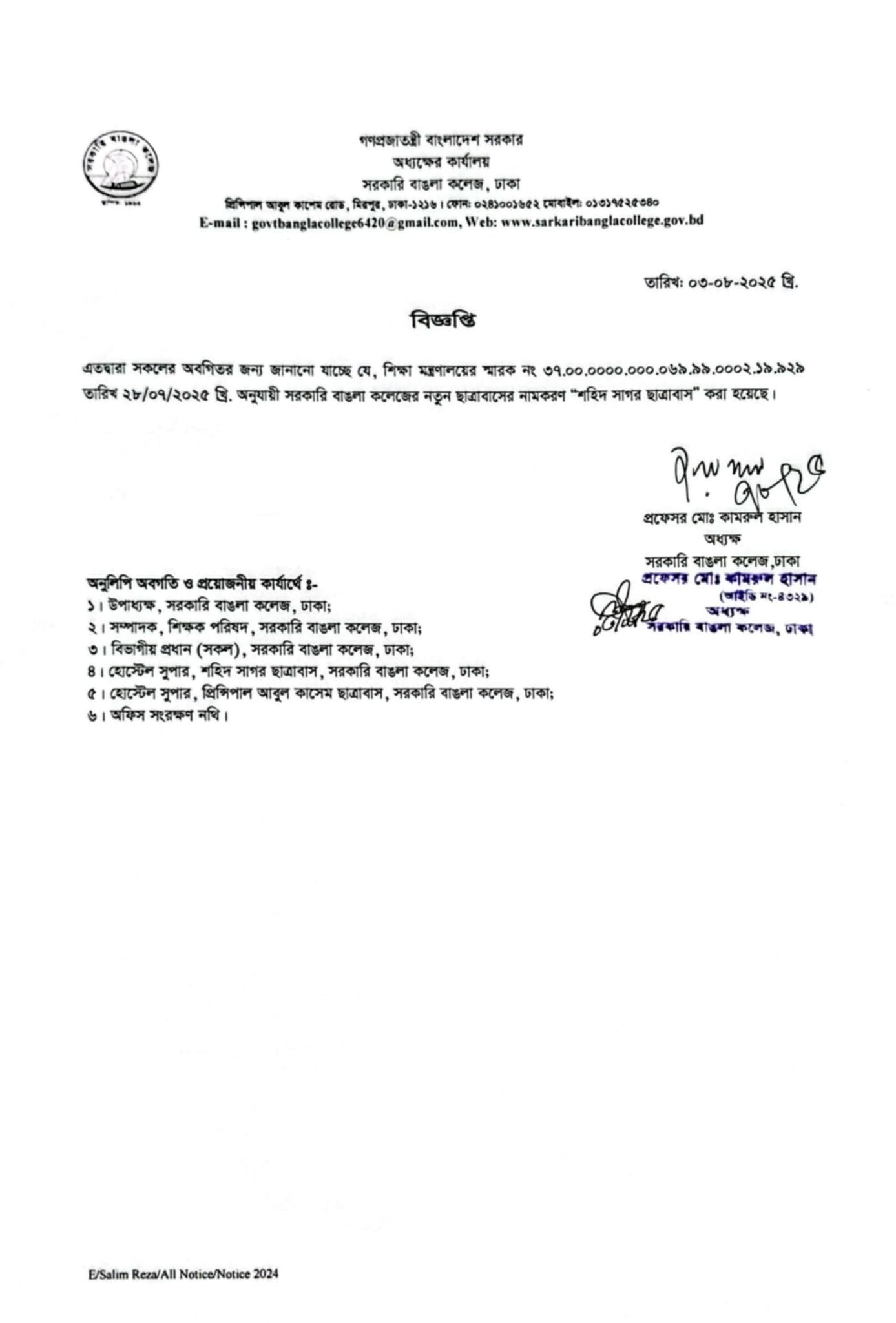 নতুন ছাত্রাবাসের নামকরণ প্রসঙ্গে