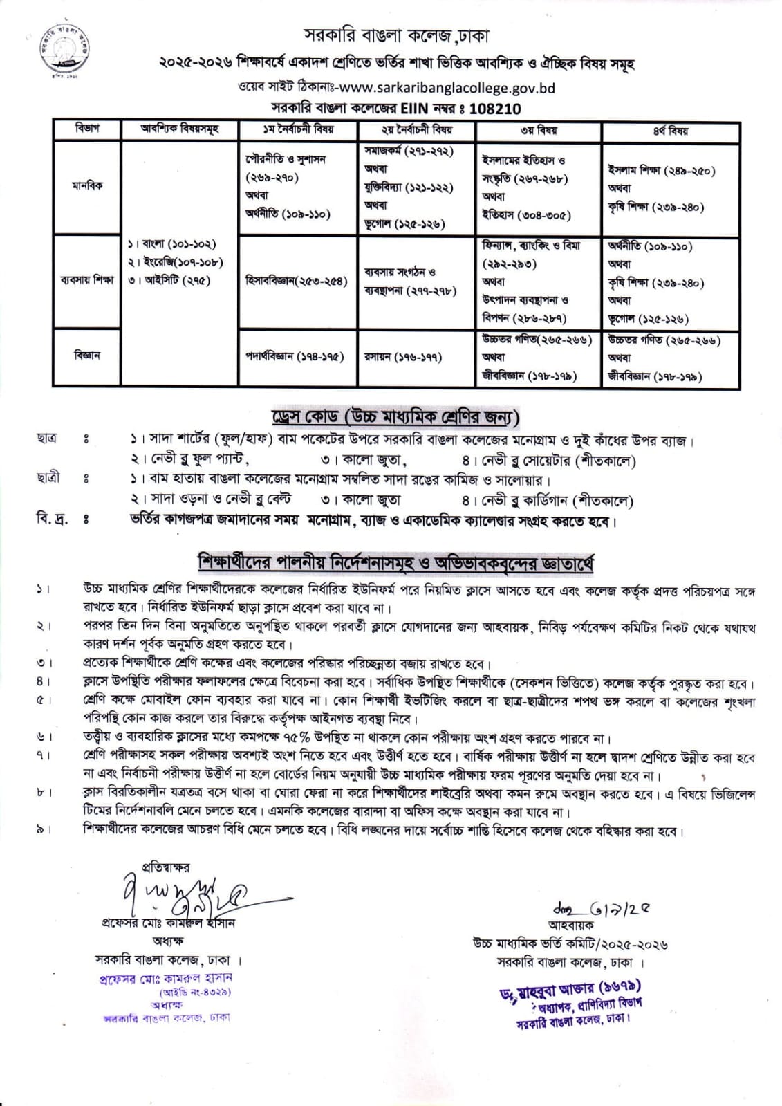 ** ২০২৫-২০২৬ শিক্ষাবর্ষে একাদশ শ্রেণিতে ভর্তির শাখা ভিত্তিক আবশ্যিক ও ঐচ্ছিক বিষয় সমূহ **