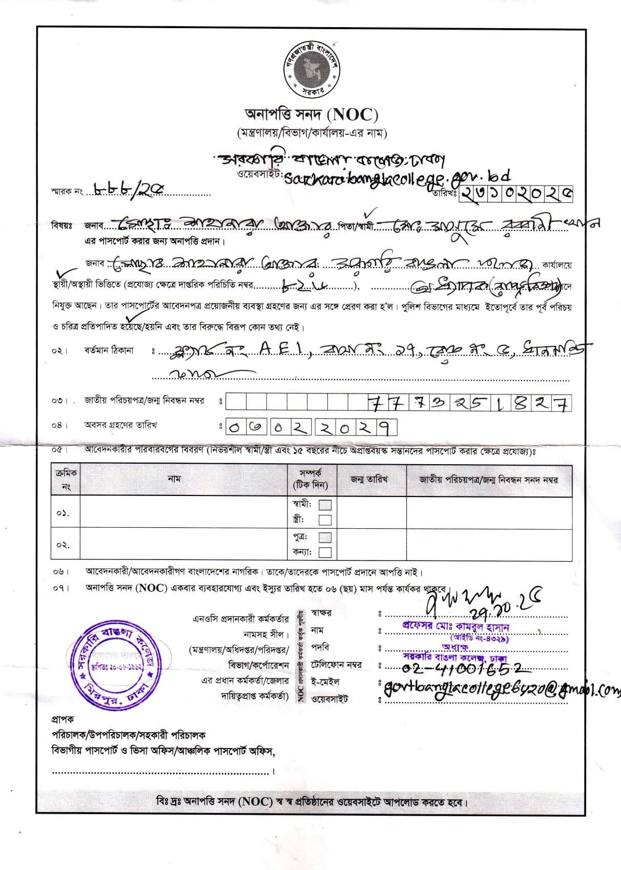 প্রফেসর শাহানারা আক্তার এর অনাপত্তিপত্র